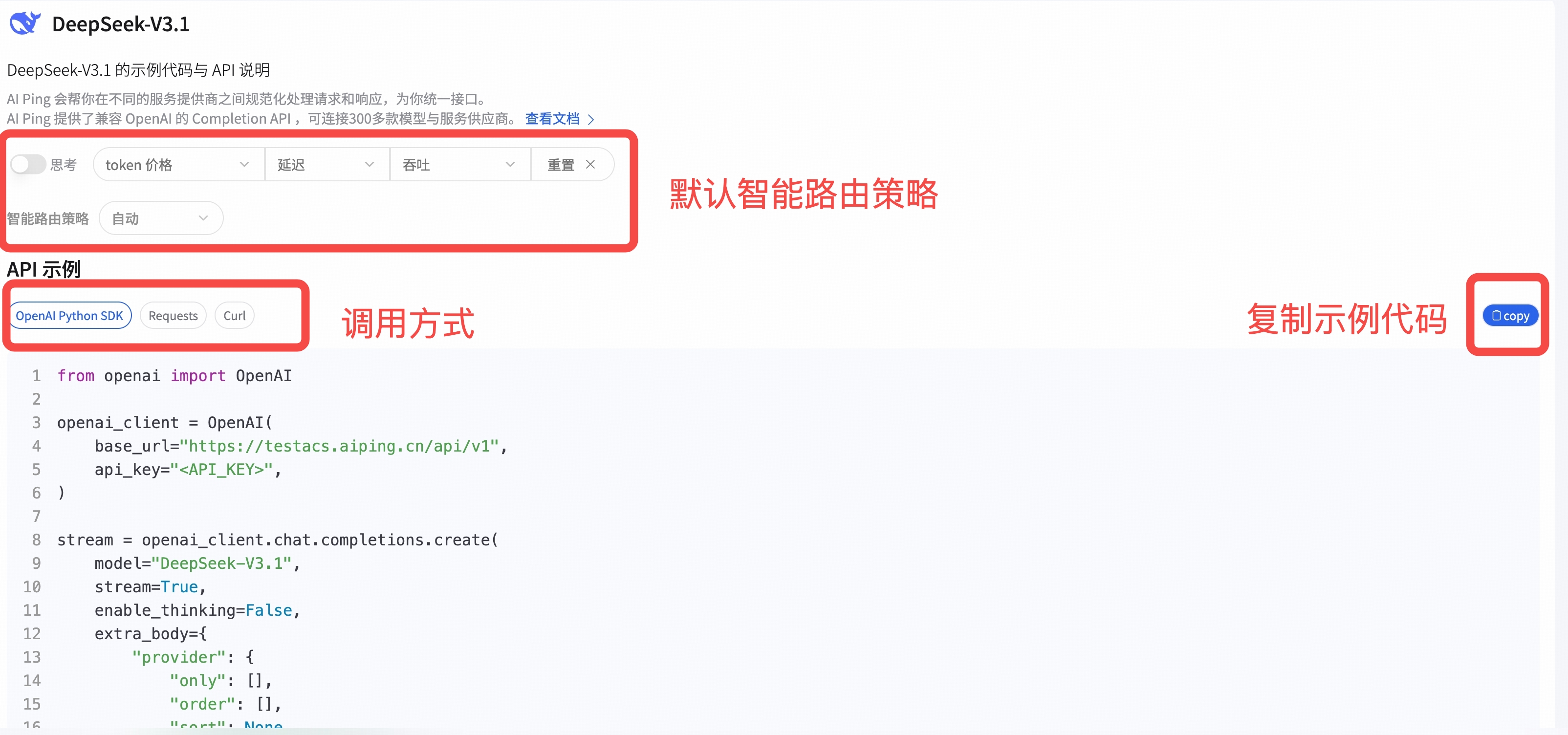 AI Ping 默认为您创建一个默认的 API 密钥,因此首次调用前不需要单独创建密钥。在复制示例代码时,AI Ping 将为您自动填充默认的 API 密钥。更多 API 密钥相关操作,可查看 API Key。